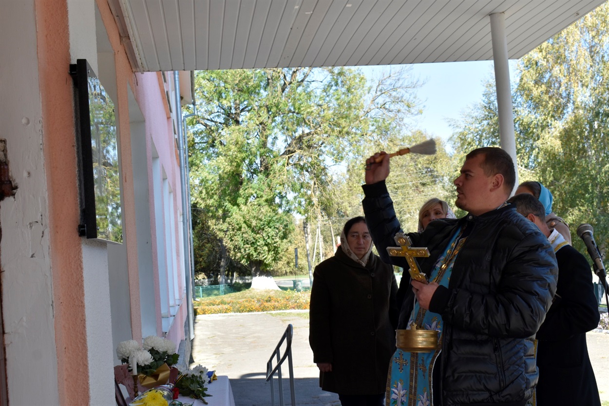 За народною традицією настоятель храму Святого апостола Андрія Першозванного отець Леонід освятив меморіальну дошку Героя України Артема Полянського та зачитав спільну молитву з присутніми.