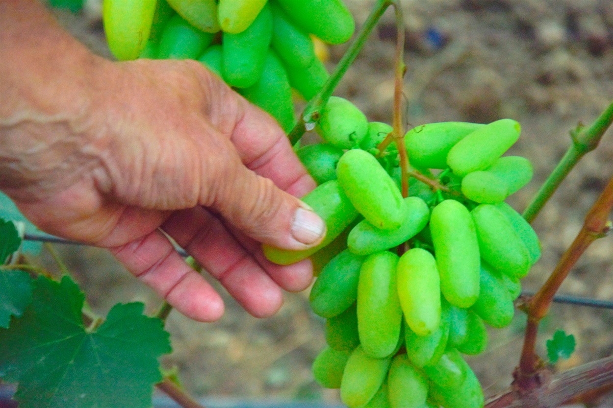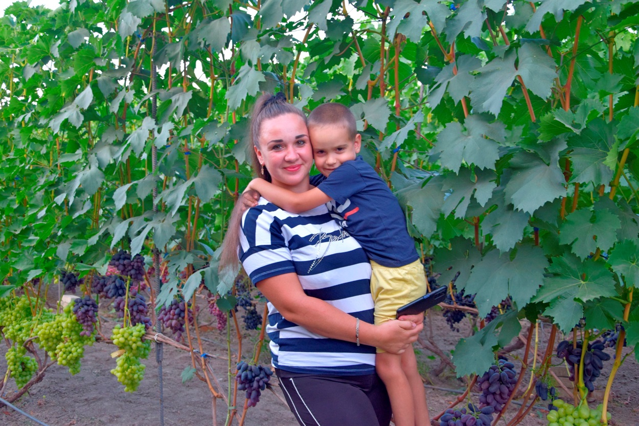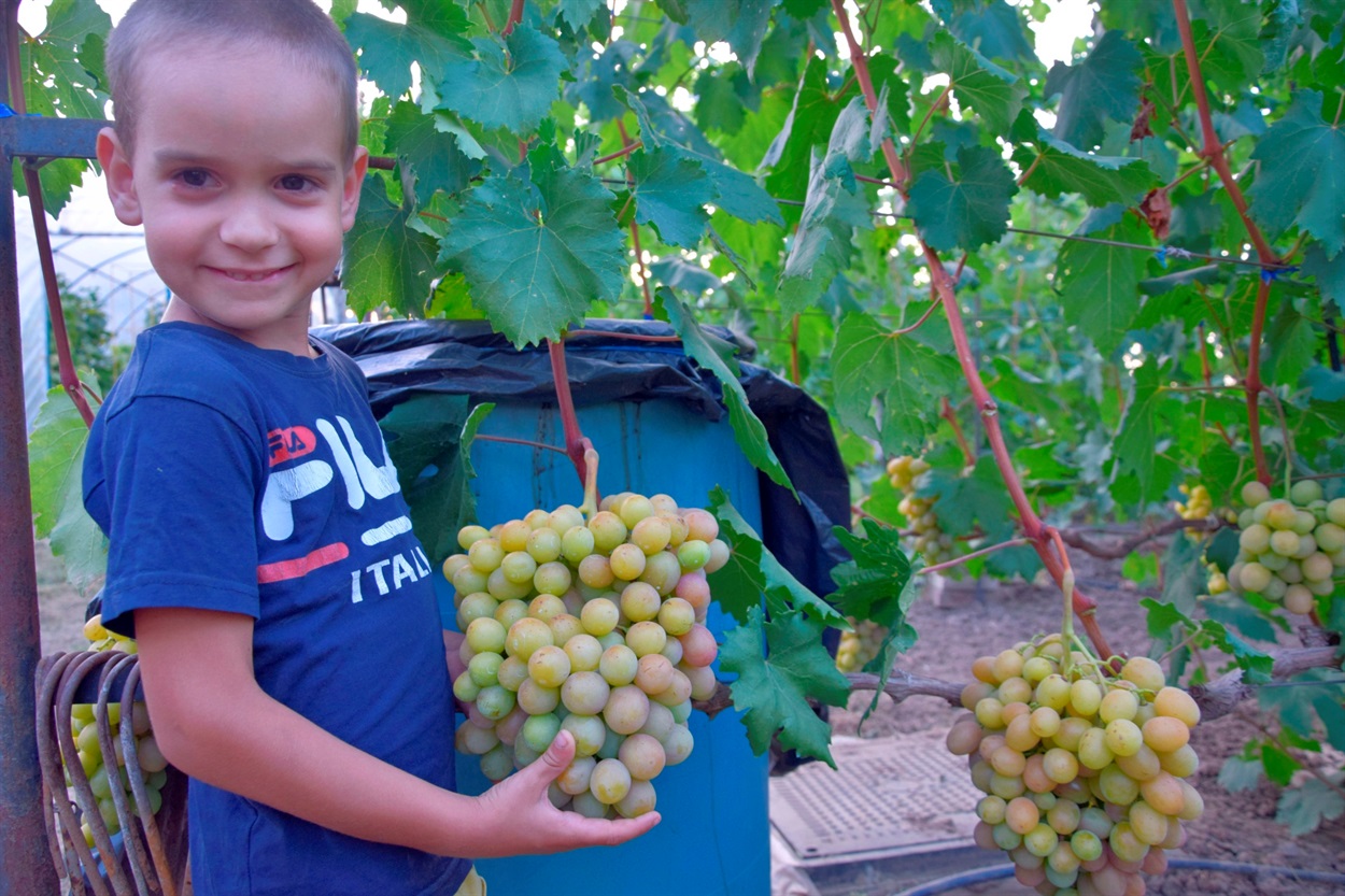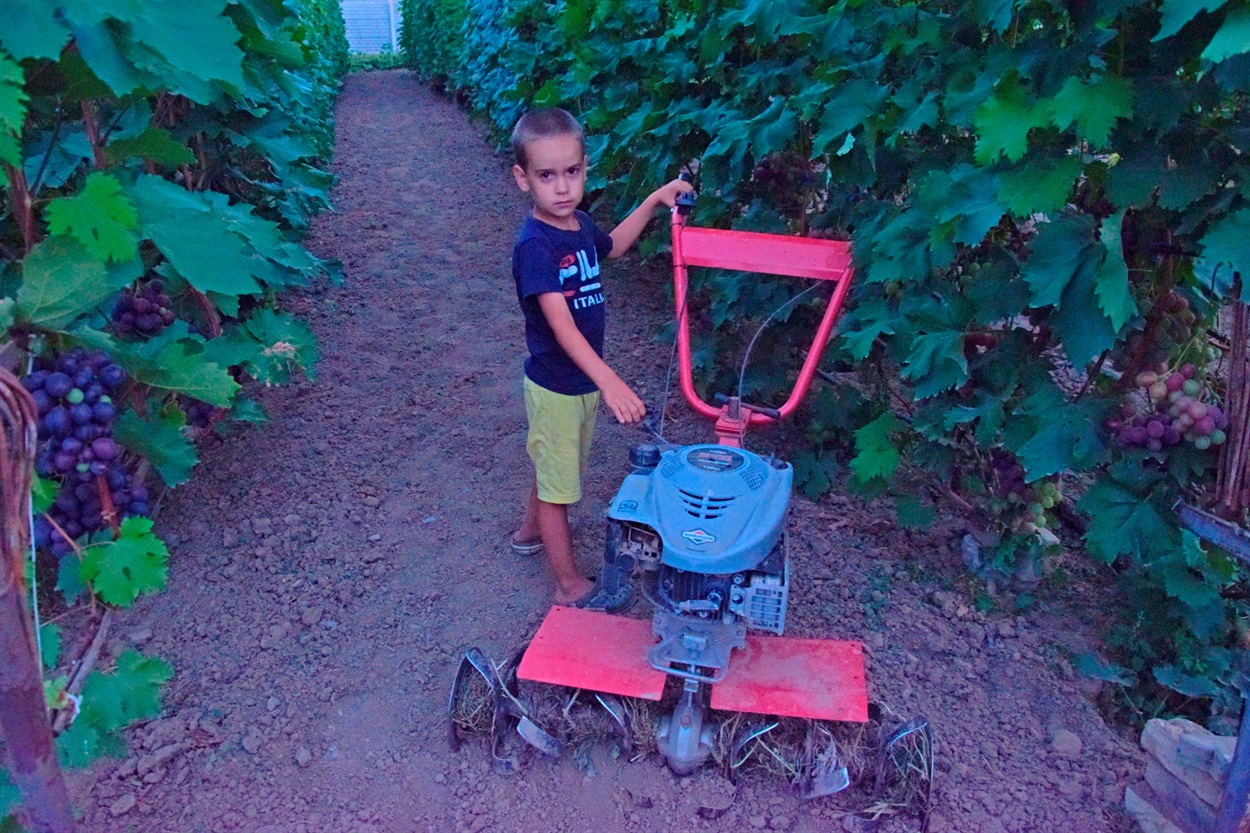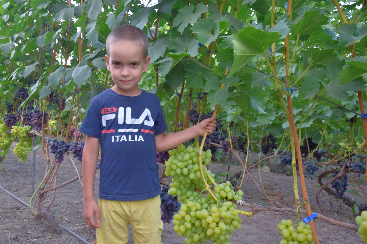 Доглядати за виноградниками чоловіку допомагає уся рідня, і навіть маленький онук Максимка, який з радістю нам показує свій улюблений сорт винограду.