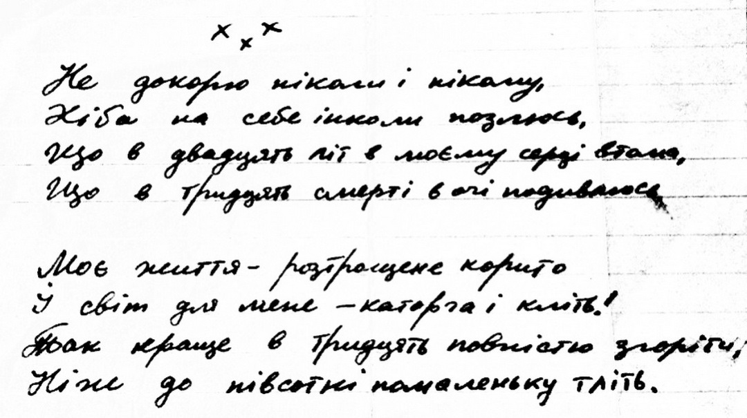 Люся! Я вже встиг солідно скучити за тобою. Всі дівчата в темно-голубих пальтах здалеку чомусь дуже похожі на тебе, а зблизька – ні. Жаль. Люблю тебе дико. Ніколи ніхто так ще не морочив мені голови. На папері цілуватися не дуже смачно, але я цілую мою маленьку Люсю мільйон разів. Губи не заболять – не бійся.