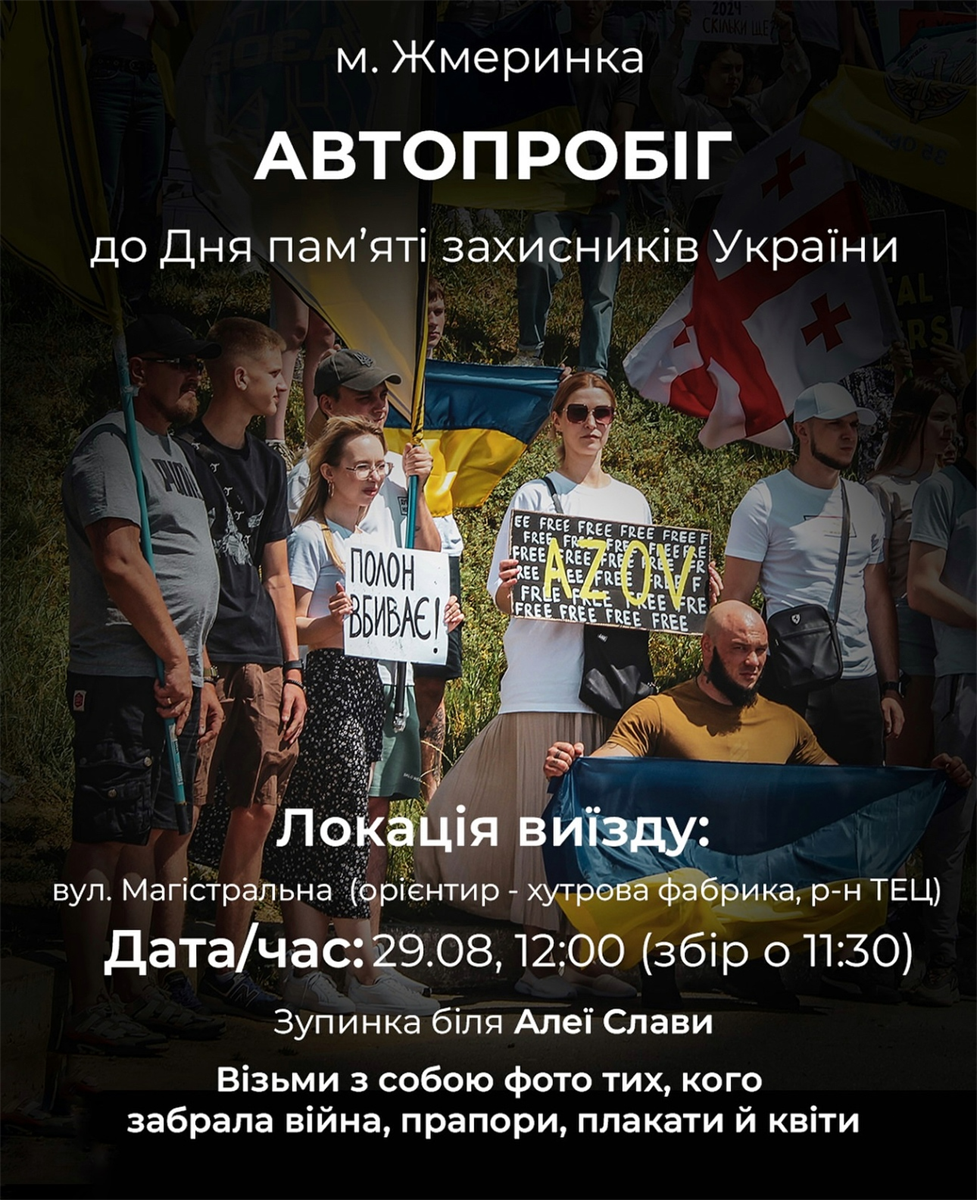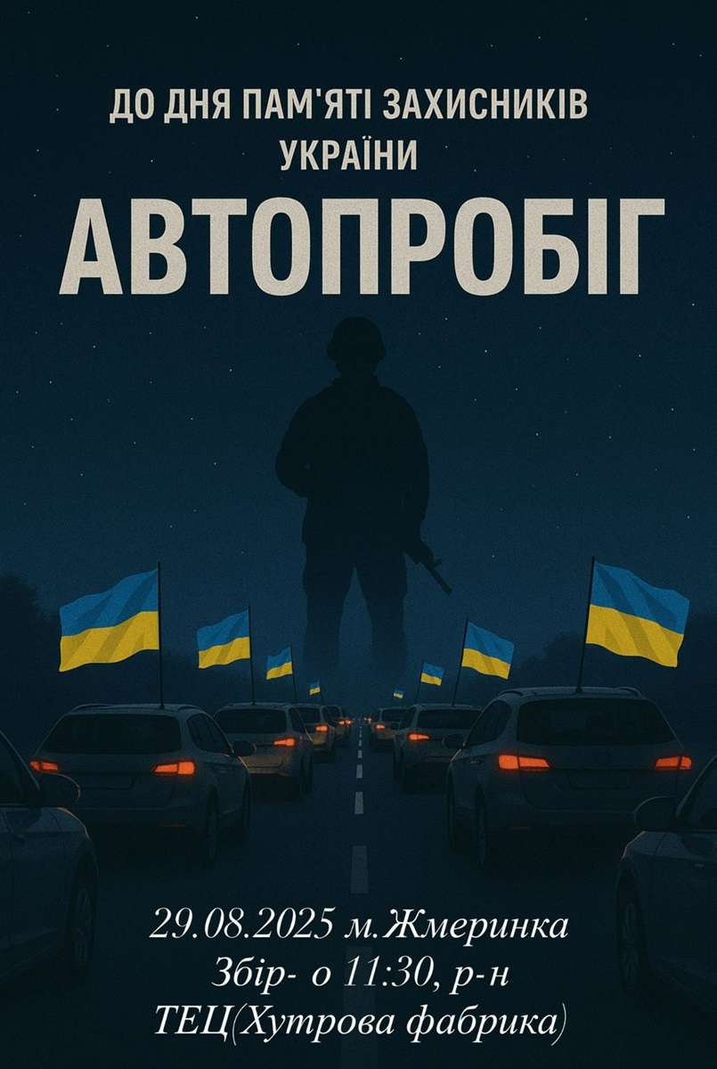 У п’ятницю, 29 серпня, у День Захисників України, що загинули в боротьбі за незалежність, суверенітет і територіальну цілісність України, у Жмеринці відбудеться автопробіг. З собою просять взяти квіти і прапори. Збір об 11.30 на «ТЕЦі» (біля хутрової фабрики), зупинка – Алея Слави Героїв в центрі міста.