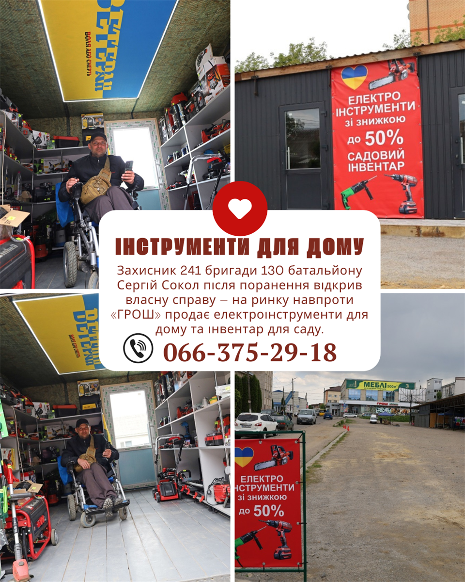«Інструменти для дому і саду» – захисник 241 бригади 130 батальйону Сергій Сокол після поранення відкрив у Жмеринці власну справу і на ринку навпроти «ГРОШ» продає електроінструменти для дому і садовий інвентар.
