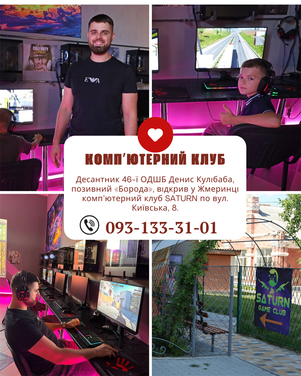 «Комп’ютерний клуб SATURN» – десантник 46-ї ОДШБ Денис Кулібаба, позивний «Борода», відкрив у Жмеринці комп’ютерний клуб SATURN по вул. Київська, 8. Ідея започаткувати власну справу виникла під час реабілітації після поранення. Саме тоді Денис захотів зіграти у комп’ютерні ігри, але виявив, що у Жмеринці немає подібного клубу. Тож разом із другом вирішив створити простір для відпочинку, спілкування та кіберспорту.