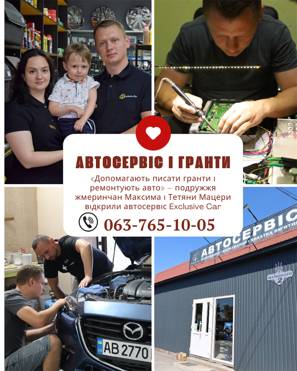 «Допомагають писати гранти і ремонтують авто» – подружжя жмеринчан Максима і Тетяни Мацери відкрили автосервіс Exclusive Car, де є хімчистка авто, рихтування, автоелектрики, магазин із продукцією для автовласників, виготовлення автомобільних ключів. Вони також допомагають жмеринчанам писати гранти на відкриття бізнес-ідей.