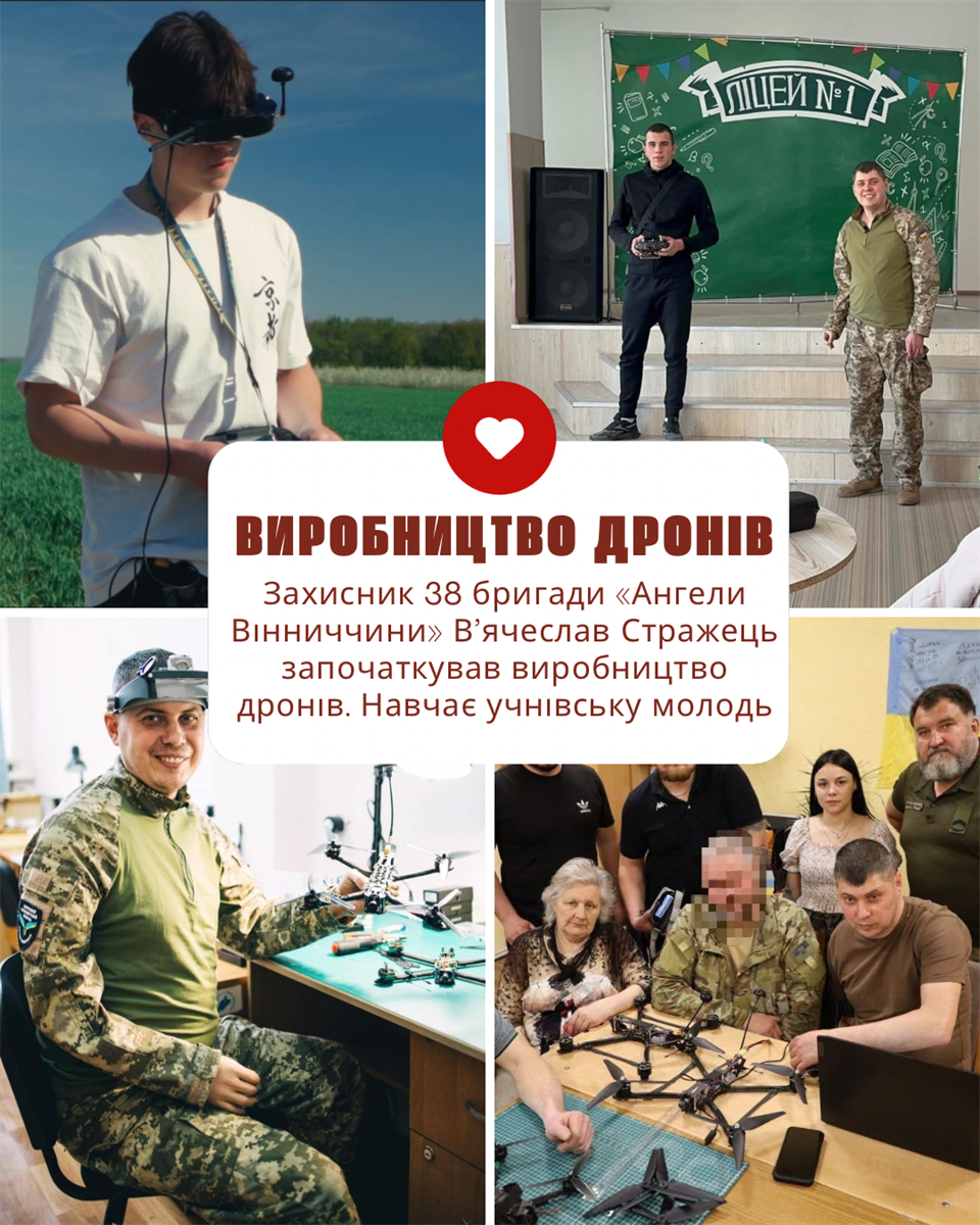 «Ветеранський бізнес» – захисник 38 бригади «Ангели Вінниччини» В’ячеслав Стражець започаткував виробництво дронів, і разом з ветеранами війни та небайдужими жмеринчанами підтримують українську армію. Також В’ячеслав навчає керувати дронами учнівську молодь громади.
