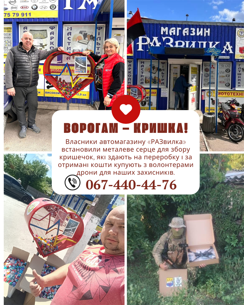 Власники автомагазину «РАЗвилка» Людмила та Олексій Гніца встановили металеве серце для збору кришечок, які здають на переробку і за отримані кошти купують дрони для наших захисників.