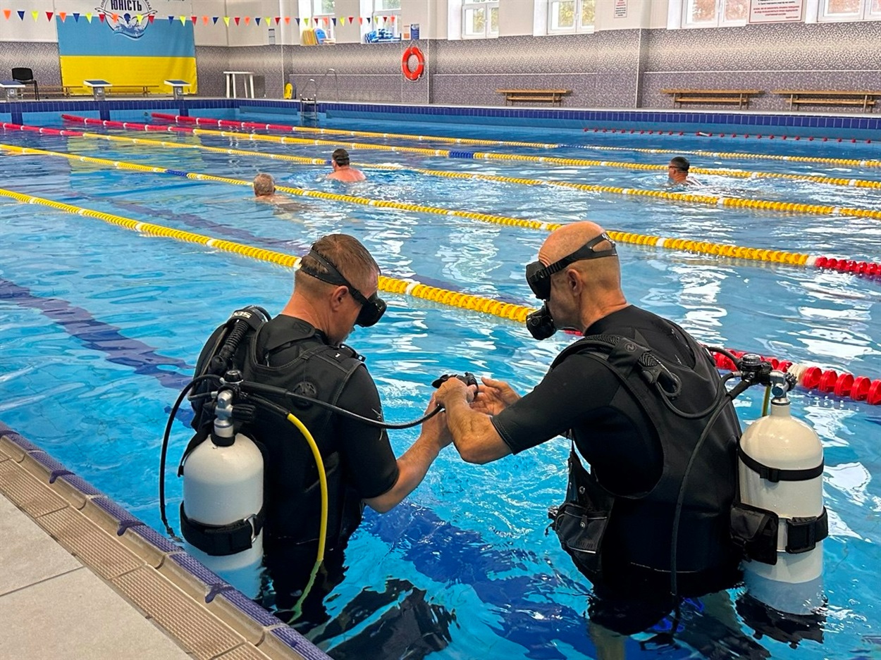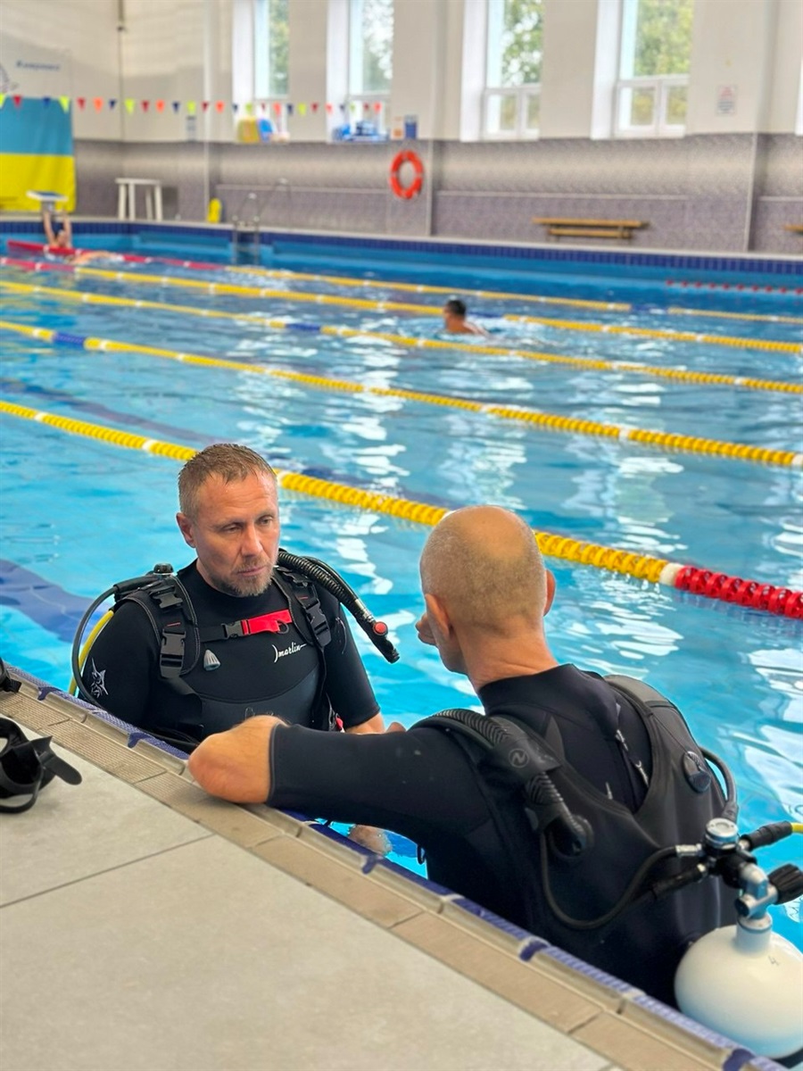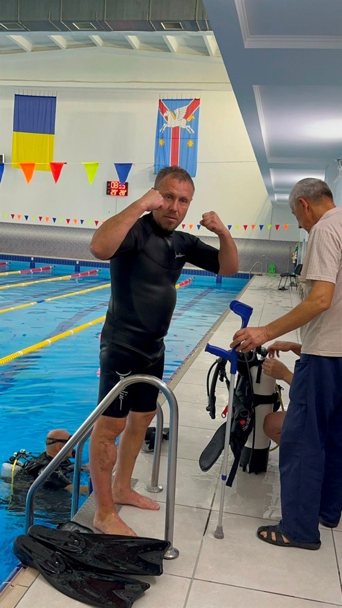 Андрій разом із тренером з дайвінгу, директором басейну «Юність» Сергієм Фіглярським занурився зі спеціальним обладнанням у воду. Військовий каже, що спробував занурення вперше у житті, відчуття – приємні.