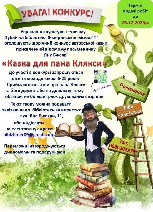 Управління культури і туризму спільно з Публічною бібліотекою запрошують дітей та молодь віком від 6 до 25 років до участі у конкурсі «Казка для пана Клякси», присвячений відомому польському письменнику, який народився у Жмеринці, Яну Бжехві. Тексти творів приймаються до 25 грудня.