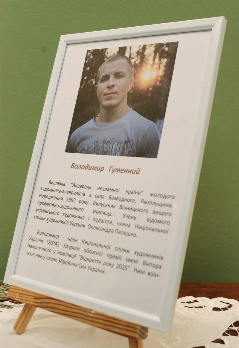 Виставка «Акварель незламної країни» художника-захисника Володимира Гуменного триватиме у Жмеринці до кінця листопада.
