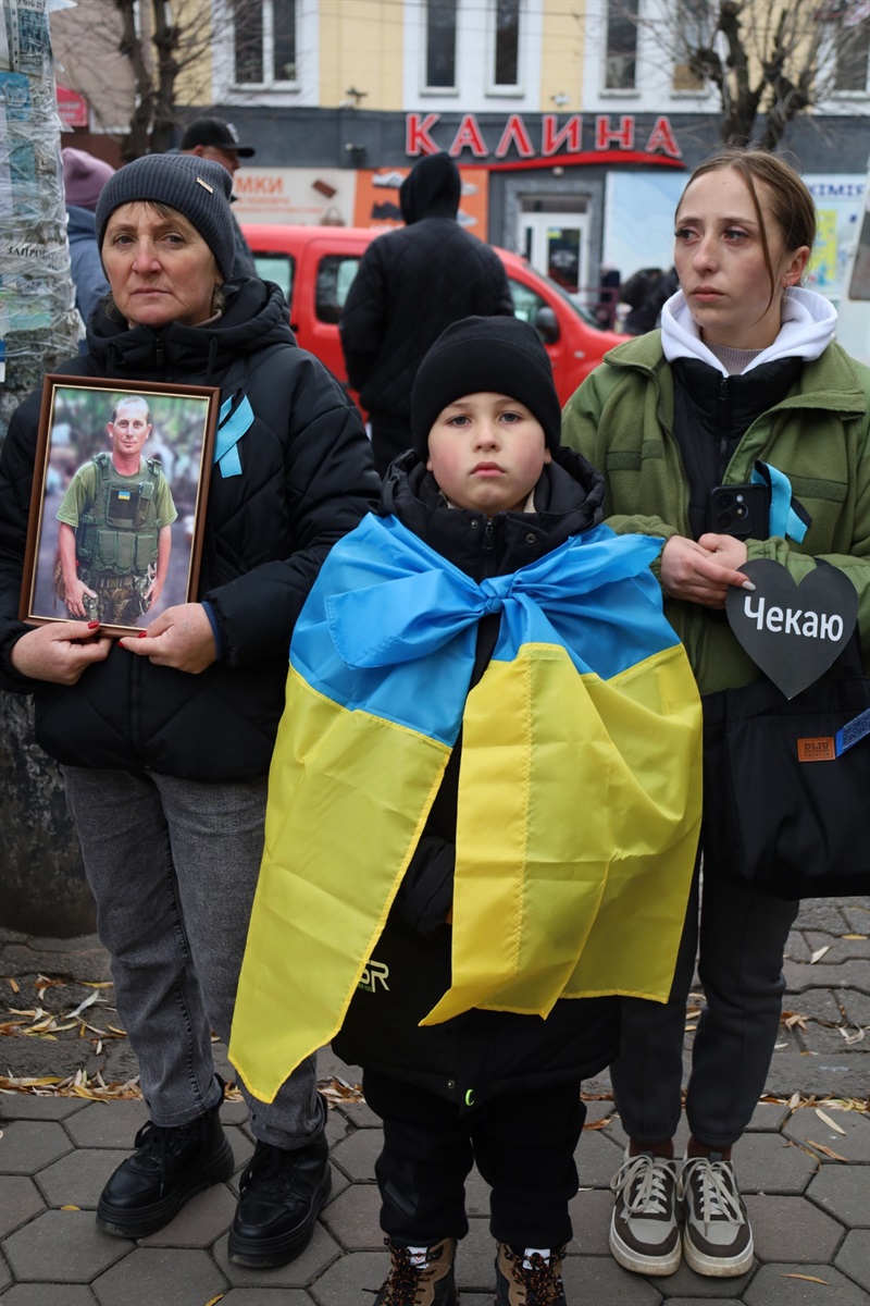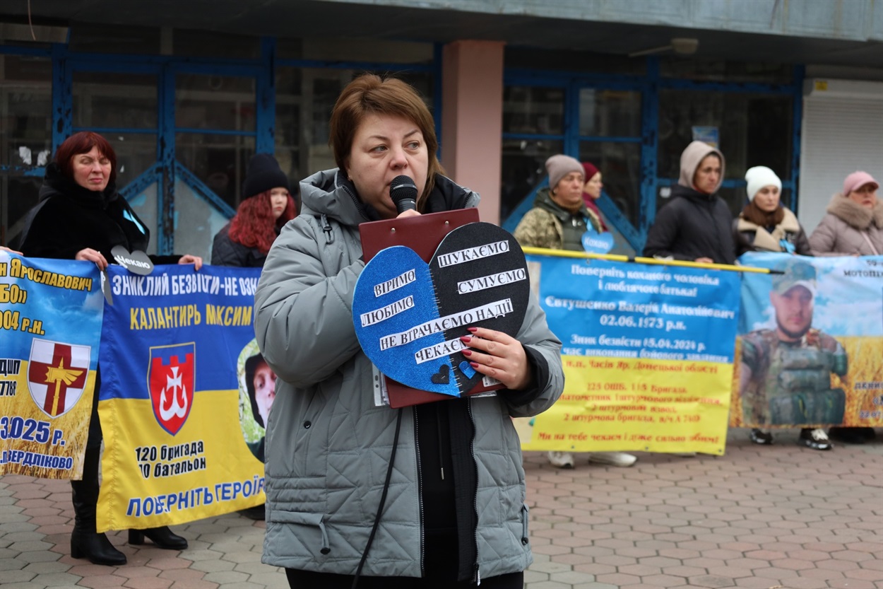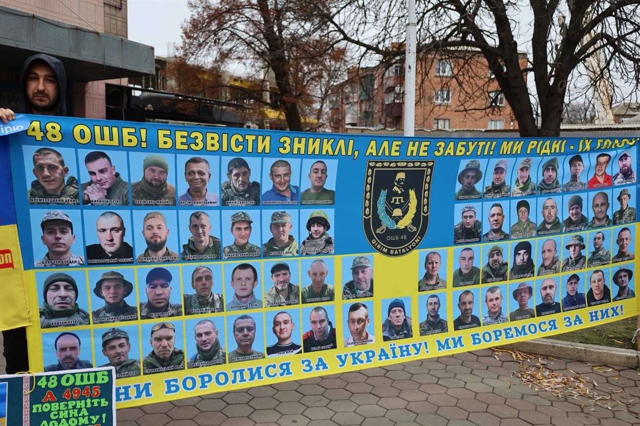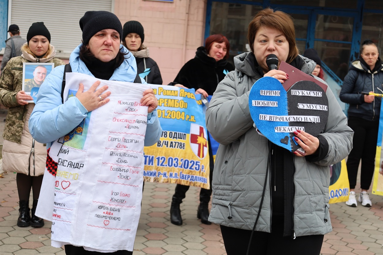 «Я нагадую, що наша акція мирна. Ми не просимо жалю до нас, ми просто нагадуємо суспільству, що війна не десь далеко, а зовсім поруч. Якщо ми не будемо допомагати військовим там, то такими кроками ворог прийде і до наших домівок. Подивіться, як нас багато! Родин, які втратили рідних на війні, і які отримують звістки про безвісти зниклих стає все більше… Портретів і банерів все більше… Ми вже відчуваємо близькість війни через обстріли енергетичних об’єктів поруч з нами, відсутність світла… А наші сім’ї, наші родини щодня відчувають ще й біль невідомості», – акцентувала Анжела Семенюк, яка чекає на звістку про сина.