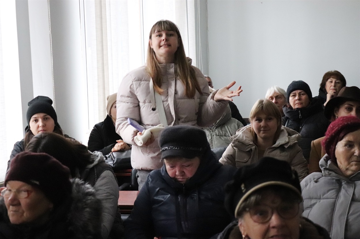 На початку зустрічі до людей звернулася заступниця міського голови Ірина Дацко, яка наголосила, що міська рада не бере участі у формуванні графіків відключень.