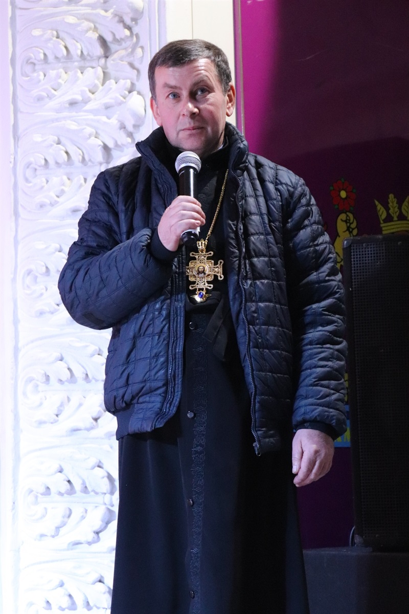 Зі сцени Центру культури та дозвілля звернувся до присутніх і отець храму Пресвятої Богородиці ПЦУ Сергій Мельник, який закликав зберігати історичну пам'ять українського народу.
