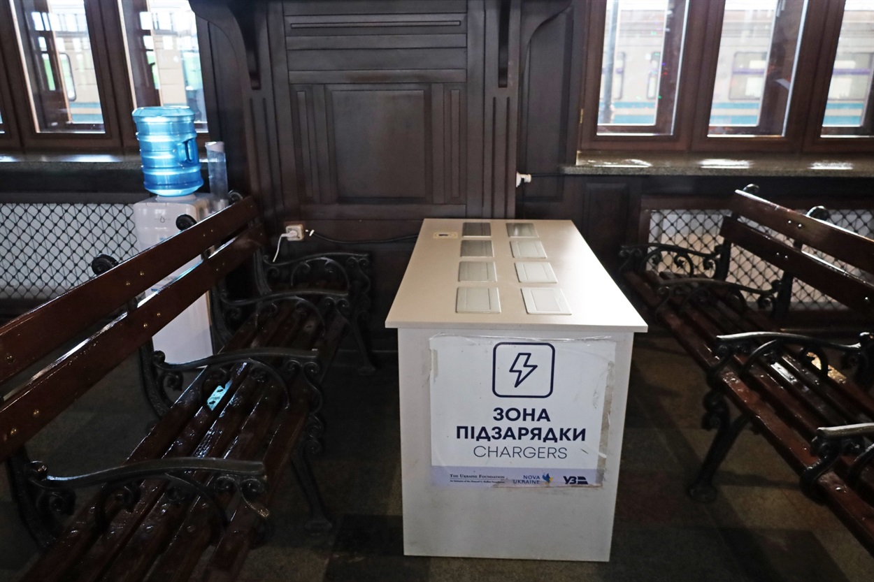 На вокзалі цілодобово працює пункт незламності: тут можна випити гарячого чаю, підзарядити гаджети, скористатися безкоштовним Wi-Fi.