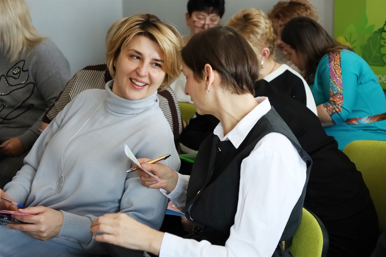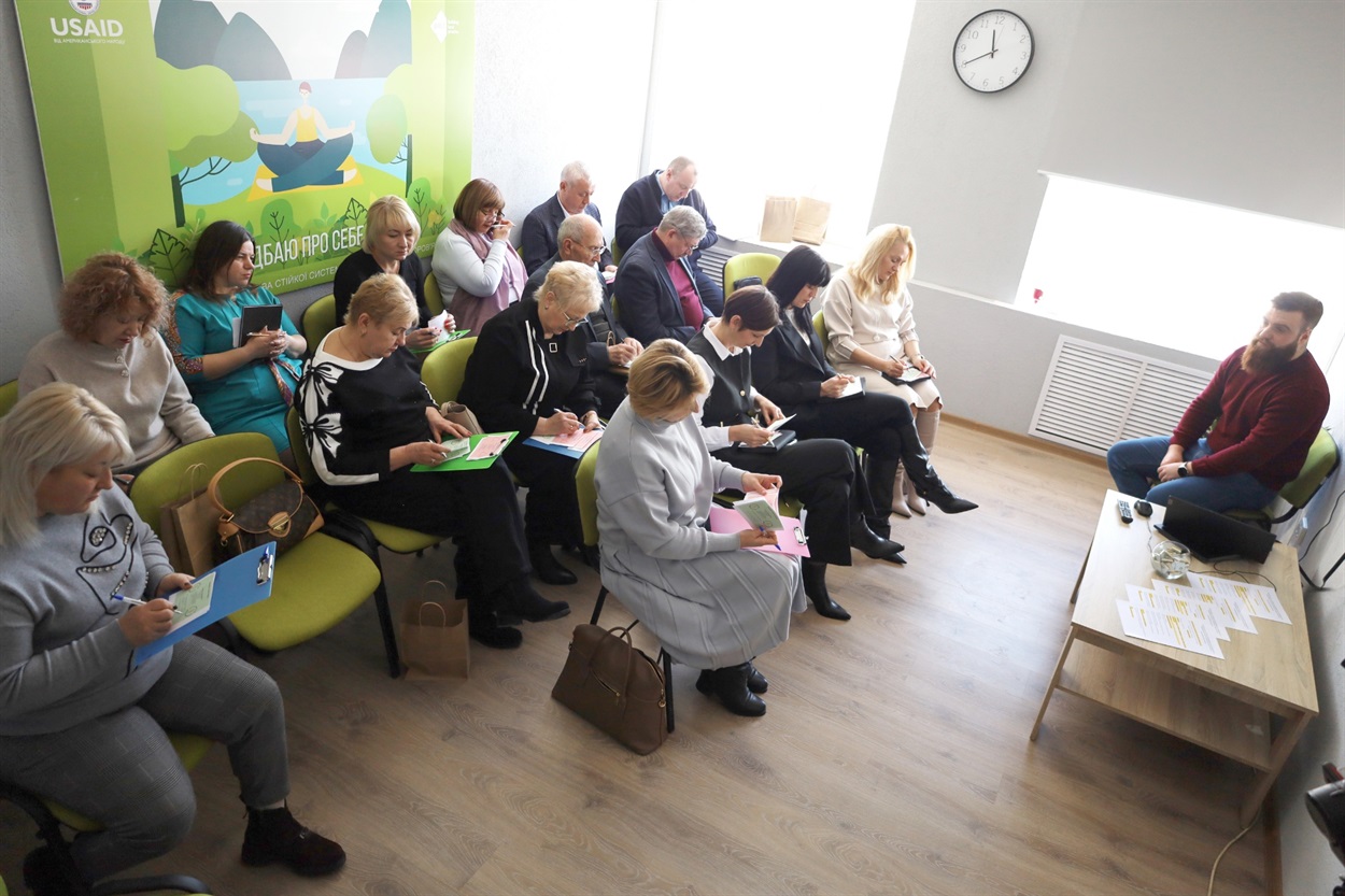 Оглянувши ресурсні кімнати та відвідавши заняття, керівники закладів загальної середньої освіти долучилися до тренінгу з психологом, викладачем кафедри та соціальної роботи ВДПУ ім. Михайла Коцюбинського Вадимом Подорожним, присвяченого темі внутрішнього ресурсу, пошуку підтримки та відновлення в умовах професійного навантаження.