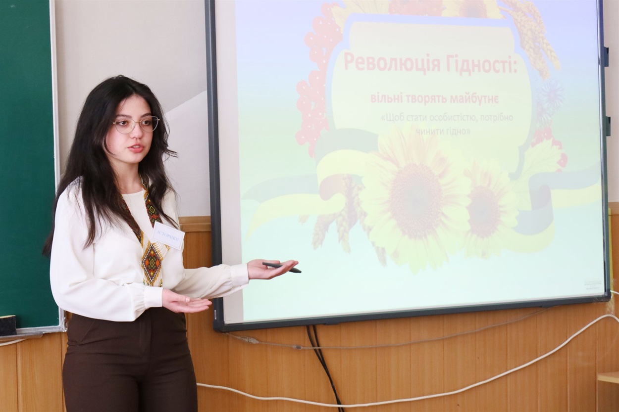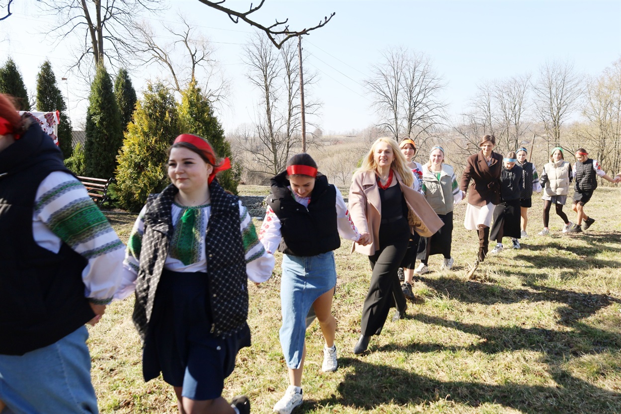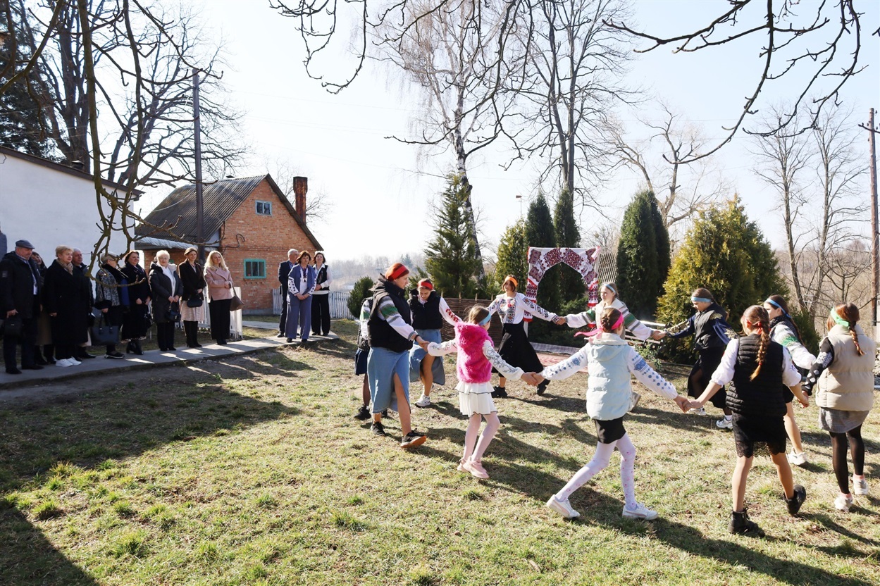 Учениці закладу підготували теплу зустріч у кращих українських традиціях. Під звуки веснянки вони запросили присутніх до обрядового «кривого танцю» - давнього українського хороводу, що символізує пробудження природи, єднання людей та заклик весни. У народній культурі цей танець виконували навесні, вірячи, що він допомагає пришвидшити прихід тепла та нового життєвого циклу.