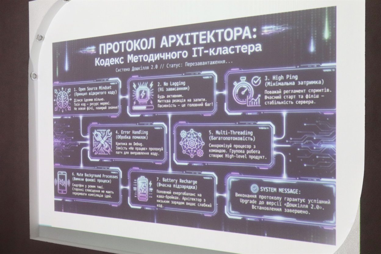 Атмосфера заходу одразу налаштовувала на зміни: затемнена зала, сучасні підсвітки, роботи та інтерактивні елементи створювали відчуття інноваційного простору майбутнього. Учасники ніби потрапили до освітньої лабораторії, де народжуються нові підходи та ідеї.