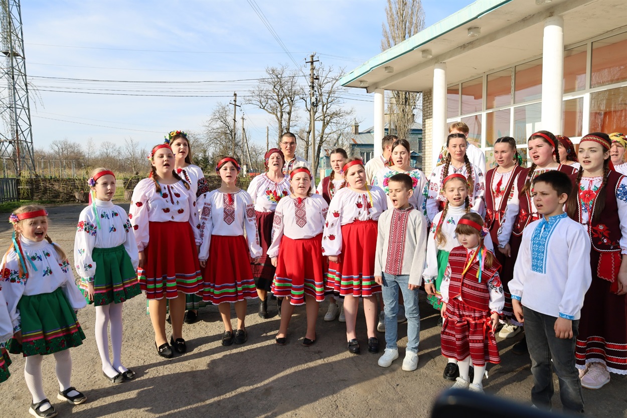 Цього разу діти й молодь вітали жителів села з Великоднем, виконуючи гаївки поруч зі святинею Православної церкви України.